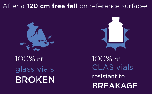 • CLAS vials have proven to have 33% less impact on the environment than glass vials.1